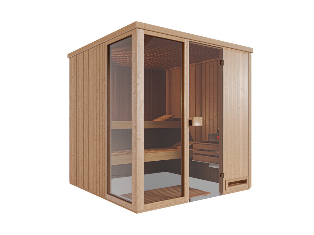 Ce modèle de sauna – un sauna modulaire, c’est‑à‑dire un sauna avec éléments préfabriqués – se distingue par sa construction sandwich particulière : les éléments de paroi sont constitués de plusieurs couches. Les éléments de paroi préfabriqués en épicéa permettent un montage rapide en quelques heures seulement. Avec une épaisseur de paroi de 68 mm, les saunas modulaires sont parfaitement isolés et donc particulièrement économes en énergie. Grâce à ces éléments très bien isolés, le sauna modulaire chauffe exceptionnellement vite.