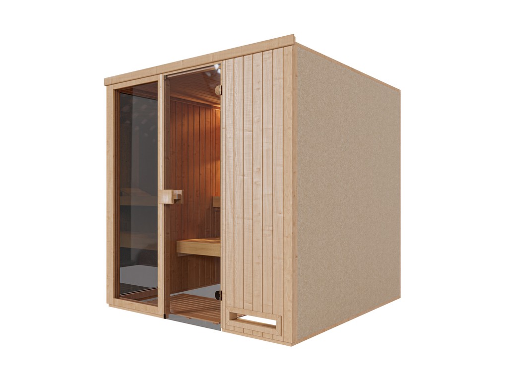 Ce modèle de sauna – un sauna modulaire, c’est‑à‑dire un sauna avec éléments préfabriqués – se distingue par sa construction sandwich particulière : les éléments de paroi sont composés de plusieurs couches. Les éléments de paroi préfabriqués en épicéa permettent un montage rapide en quelques heures seulement. Avec une épaisseur de paroi de 68 mm, les saunas modulaires sont parfaitement isolés et donc particulièrement économes en énergie. Grâce aux éléments très bien isolés, ce sauna modulaire monte en température particulièrement vite.
