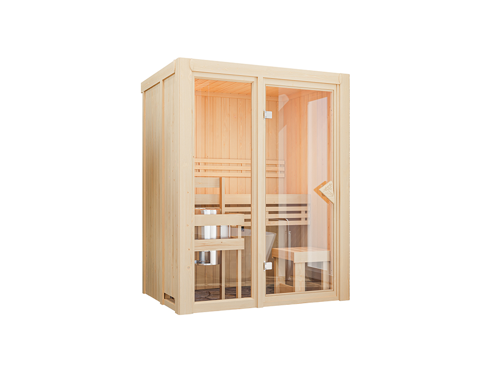 Sauna intérieur Karibu modulaire Paradiso 1 adapté pour 2-3 personnesLors de l’installation d’un sauna, il est essentiel de respecter une distance minimale de 10 cm par rapport aux murs et au plafond afin de garantir une bonne circulation de l’air. L’air chaud et humide peut ainsi mieux s’évacuer. Dans ce contexte, la hauteur et la largeur minimales de la pièce doivent être respectées.Équipement de baseDimensions intérieures : les dimensions intérieures de ce sauna, L 200 x P 104 x H 192 cm, lui permettent d’accueillir 2-3 personnes en même temps.Bancs : avec 1 banc, l’expérience est particulièrement agréable pour chaque visiteur du sauna. L’équipement de base comprend les bancs suivants : 1 banc, chacun d’environ 57 cm de large (bois de tilleul massif).Entrée par l’avant : ce sauna à entrée classique par l’avant est spacieux, esthétique et traditionnel.Variante de porteLa porte en verre bronzé de 8 mm d’épaisseur est insérée dans un cadre de porte en bois massif. Le verre de sécurité trempé utilisé a subi un traitement thermique spécial qui le rend insensible aux variations de température. La porte a une dimension de montage de 78 x 187,1 cm pour une dimension de passage de 64 x 173 cm. Les ferrures de porte de couleur brune sont librement réglables pour un alignement optimal et précis. Elle est équipée d’une poignée de porte de haute qualité au design élégant KARIBU et d’une technique de fermeture magnétique éprouvée.Inclus dans la livraison :poêle sauna de 3,6 kW, commande externe, 1 banc, dossier et banquette en bois de tremble, grille de protection du poêleAccessoires recommandésLes pierres de diabase ne sont pas incluses dans la livraison. Ces pierres de sauna appréciées conviennent à tous les poêles sauna et se distinguent par leur capacité particulière à accumuler la chaleur. Les pierres de diabase sont disponibles séparément dans notre boutique en ligne.Les câbles en silicone doivent être achetés séparément, en fonction de la connexion :Poêle – câble en silicone à cinq fils : de l’appareil de commande au poêle sauna (1,5 mm), câble en silicone à sept fils : de l’appareil de commande bio au poêle combiné bio (1,5 mm)Appareil de commande – câble en silicone à cinq fils : de la prise de courant fort à l’appareil de commande (2,5 mm), câble en silicone à cinq fils : de l’appareil de commande au poêle sauna (1,5 mm)Lampe de sauna – câble en silicone à trois fils : de la prise de courant/de l’appareil de commande à la lampe de sauna (1,5 mm)Couronne de toit avec lampes LED intégrées : crée une lumière harmonieuse autour de votre sauna.Grille de sol en épicéa chaude sous les pieds : pour une marche agréable à l’intérieur et à l’extérieur du sauna.Étagère pour accessoires : pour garder les accessoires en ordre.Kit d'accesoires de pour sauna 6 pièces : seau d’arrosage en bois d’épicéa robuste avec louche et insert en plastique, sablier, instrument de mesure du climat et tableau des règles à suivre pour le saunaÉquipement de base recommandé : lampe de sauna, ciel étoilé, haut-parleurs adaptés au sauna, huiles parfumées, banc de repos et repose-tête. Vous trouverez ces articles et bien d’autres dans notre gamme d’accessoires.Karibu – des produits naturels de haute qualitéKaribu est un partenaire compétent de longue date pour des abris de jardin, des saunas, des jeux, des abris de voiture ou des piscines – made in Germany. La haute qualité est la norme et seul un bois sélectionné de première qualité, provenant exclusivement de forêts d’Europe du Nord exploitées de manière durable, est utilisé. Sa croissance lente le rend particulièrement dur et résistant. Les technologies les plus modernes garantissent une fabrication sur mesure. Karibu met l’accent sur la qualité et le design.