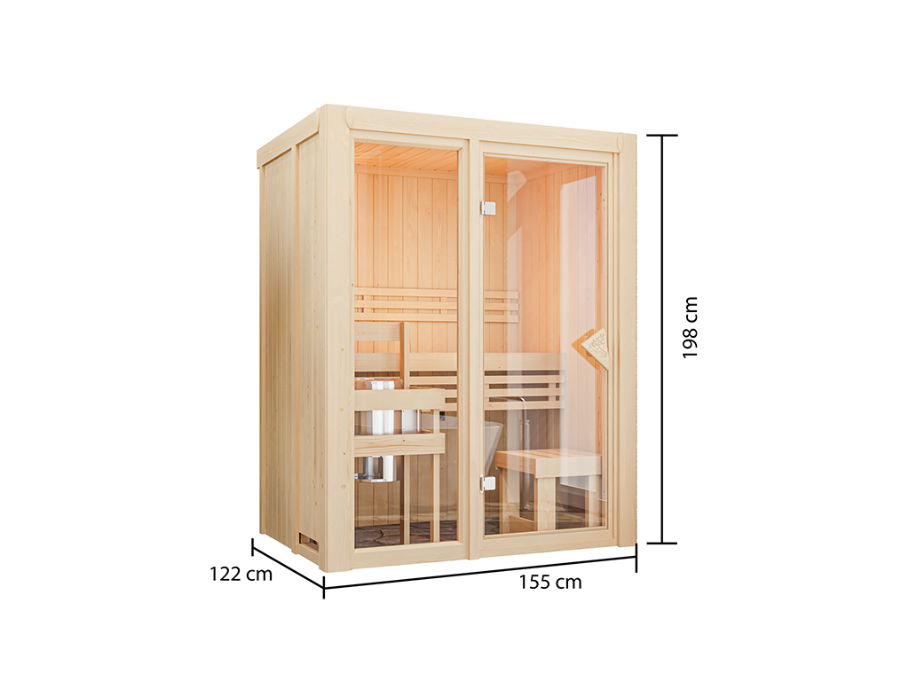 L x P x H : 216 x 122 x 199 cm, entrée par l’avant, avec 1 banc, poêle de sauna de 3,6 kW et commande externe