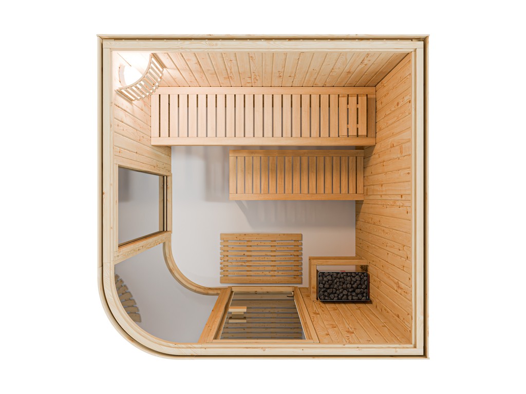 2 banquettes, 2 appuie‑têtes, protection de poêle, luminaire de sauna, caillebotis de sol, poêle de sauna 9 kW, commande externe et pierres