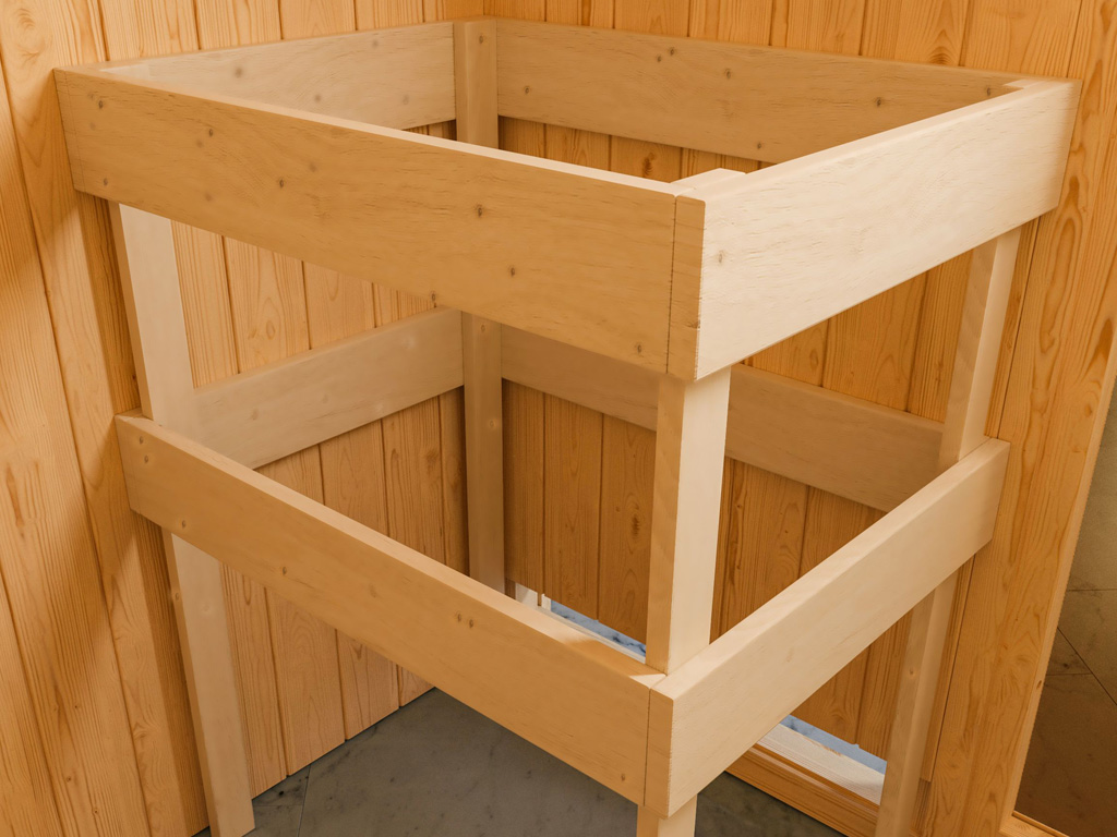 Les deux bancs stables en épicéa augmentent le confort de ce sauna intérieur. De plus, une grille de protection du poêle et un appuie-tête en épicéa massif sont inclus dans la livraison. - Accessoires recommandés
