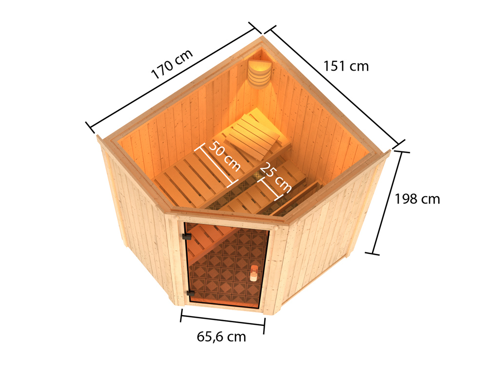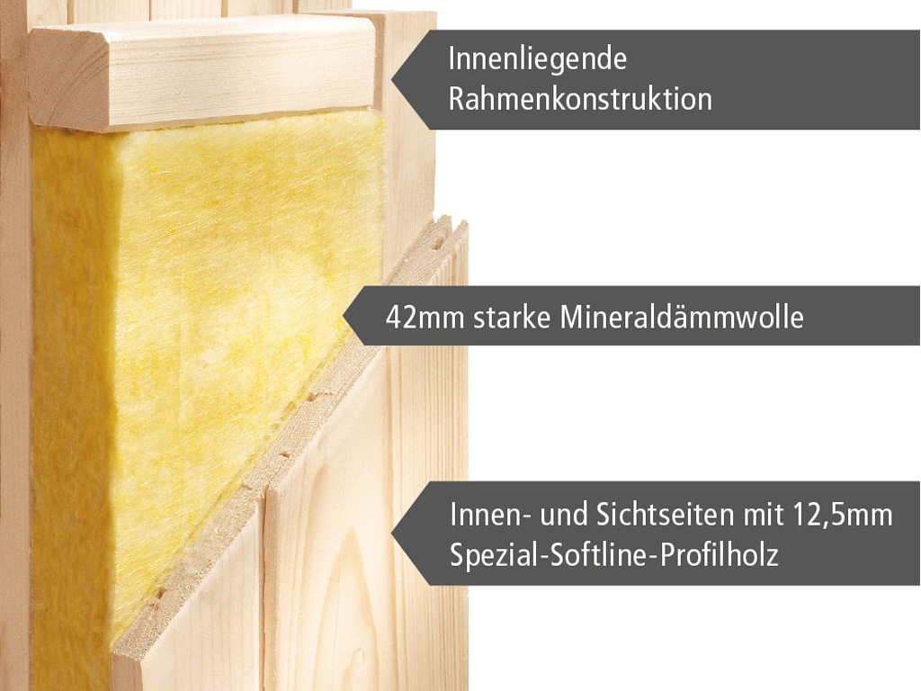 Le sauna système de 68 mm est composé d'éléments muraux préfabriqués dans lesquels est insérée une couche d'isolation en laine minérale de 42 mm. Cette méthode de construction assure une faible consommation d'énergie et simplifie le montage. Les côtés visibles de la paroi extérieure ainsi que les côtés intérieurs sont recouverts de bois profilé Softline spécial de 12,5 mm. - Porte entièrement vitrée bronzée