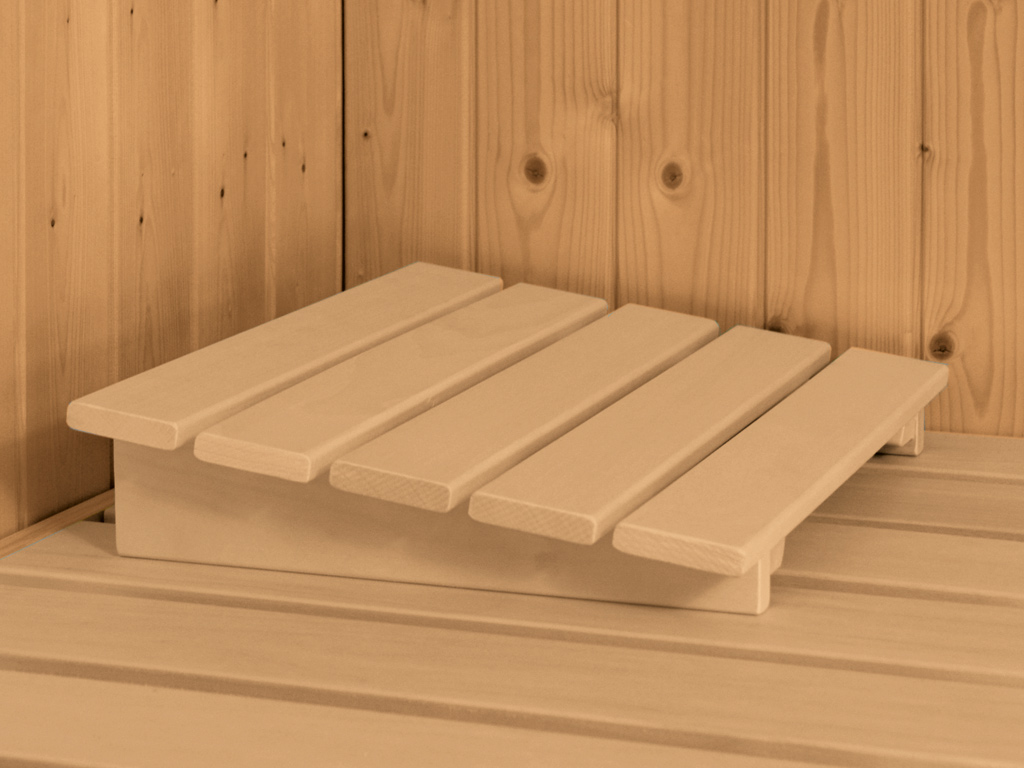 Pour compléter cette offre de sauna, nous vous recommandons l'équipement de base suivant : un poêle de sauna de 3,6 kW ou un poêle de sauna bio de 3,6 kW avec commande externe, une lampe de sauna et/ou une lumière colorée ainsi que des pierres de sauna et le kit d'accessoires de 6 pièces. Consultez notre offre d'accessoires à ce sujet.