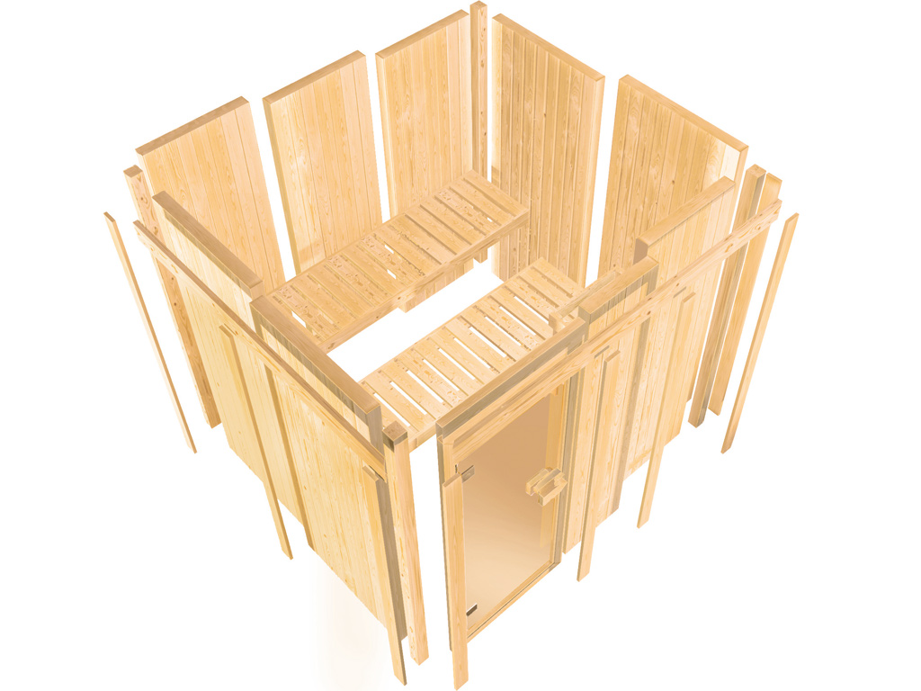 Ce sauna système de Karibu convient également aux petites pièces grâce à sa forme et à sa taille compactes. Les deux bancs du sauna offrent suffisamment de place pour profiter pleinement de la séance de sauna, même à deux. - Économe en énergie