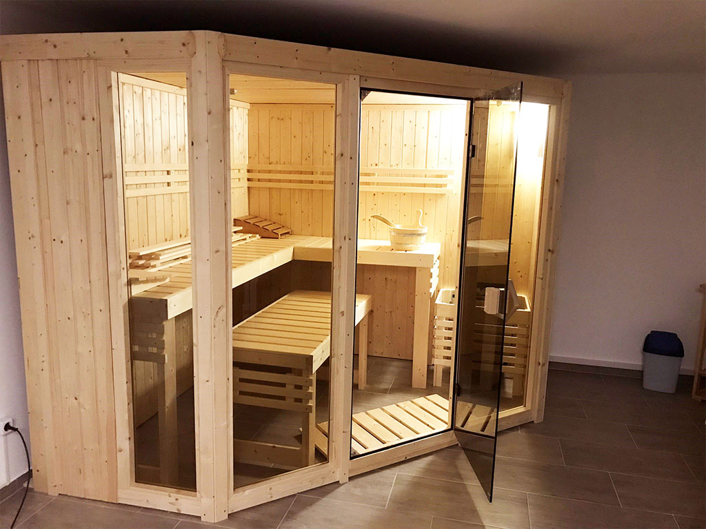 Équipement de base recommandé : Lampe de sauna, ciel étoilé, haut-parleurs adaptés au sauna, huiles parfumées, banc de repos et repose-tête. Vous trouverez ces articles et bien d'autres dans notre offre d'accessoires.