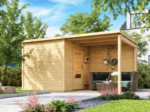 Le toit en appentis offre de nombreuses possibilités à votre sauna de jardin. Il peut être végétalisé ou même servir de base pour des panneaux solaires. Vous pouvez choisir le toit en appentis de sorte qu'il dépasse largement de la maison de sauna. Il vous offre ainsi une bonne protection contre le vent et les intempéries. Vous pouvez utiliser cet espace couvert supplémentaire pour créer une terrasse extérieure directement à côté de la maison de sauna, par exemple.