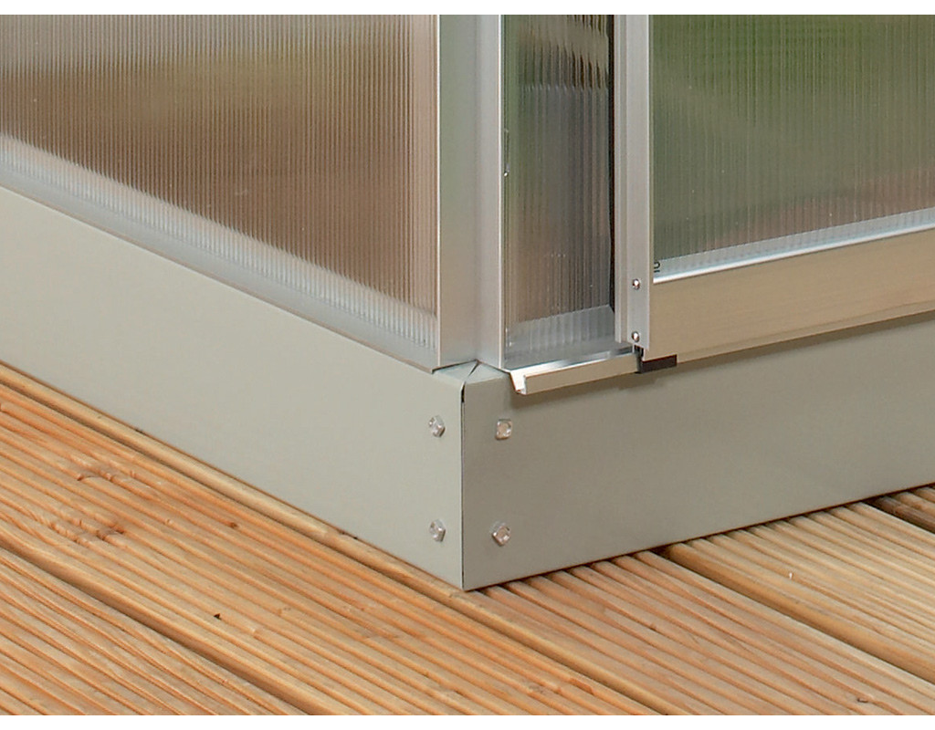 La fondation est en tôle d'acier galvanisée et peinte. Elle est parfaitement plane et d'équerre. La fondation peut être montée facilement et rapidement, ce qui simplifie le montage ultérieur de la serre. - Serre en aluminium
