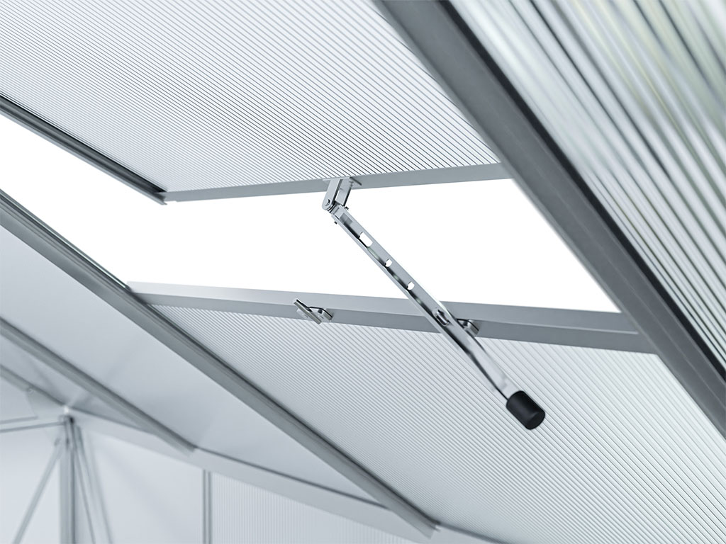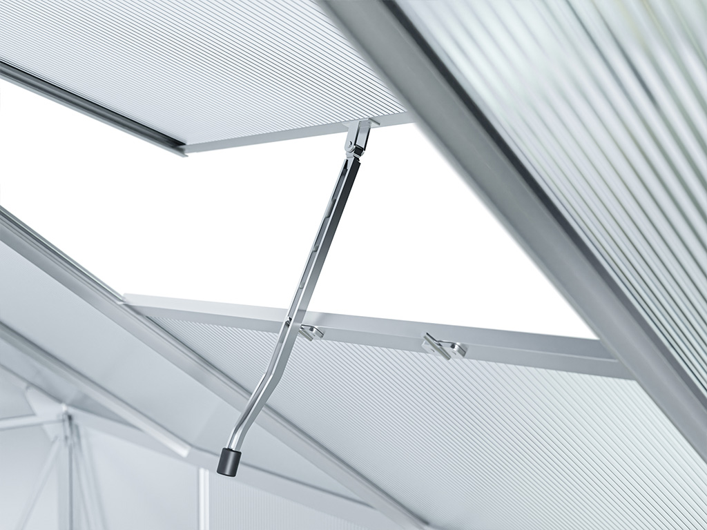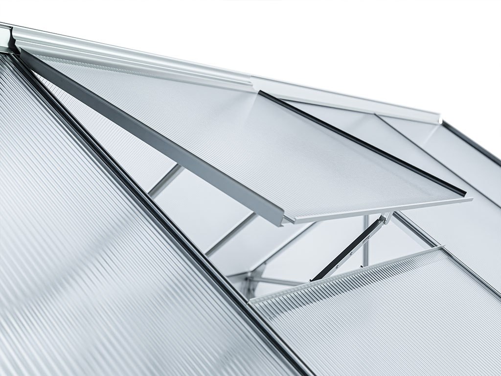 La fenêtre de toit incluse empêche la chaleur de s'accumuler dans la serre. - Fondation en acier en option (incluse uniquement dans la version « avec fondation » !)