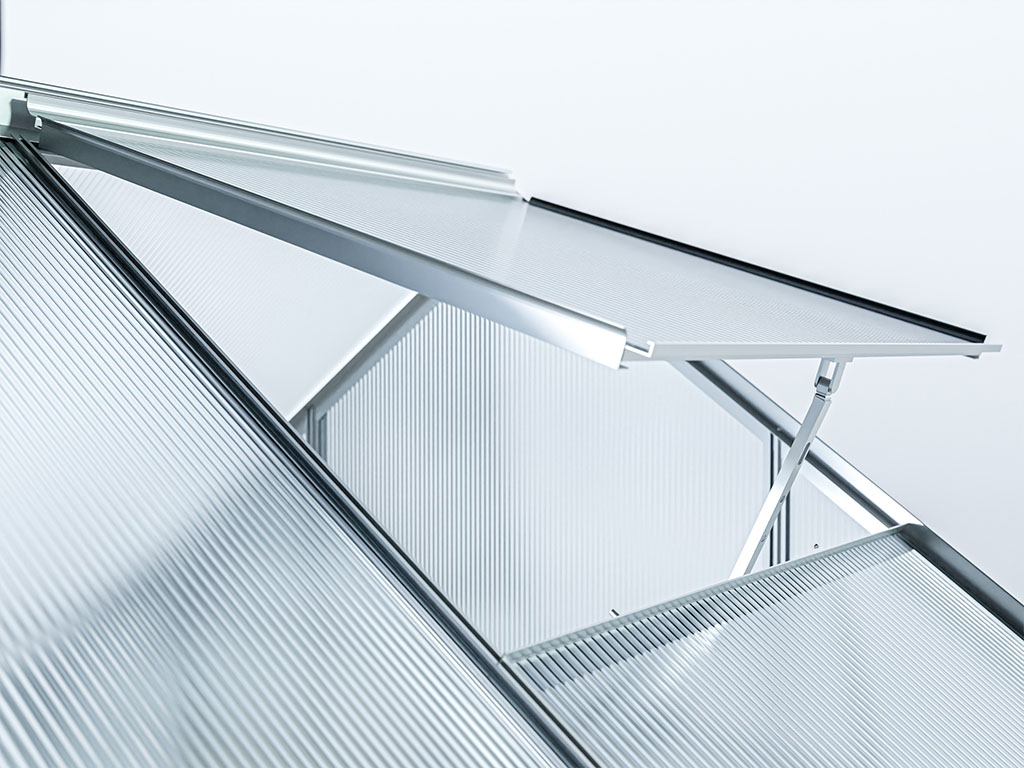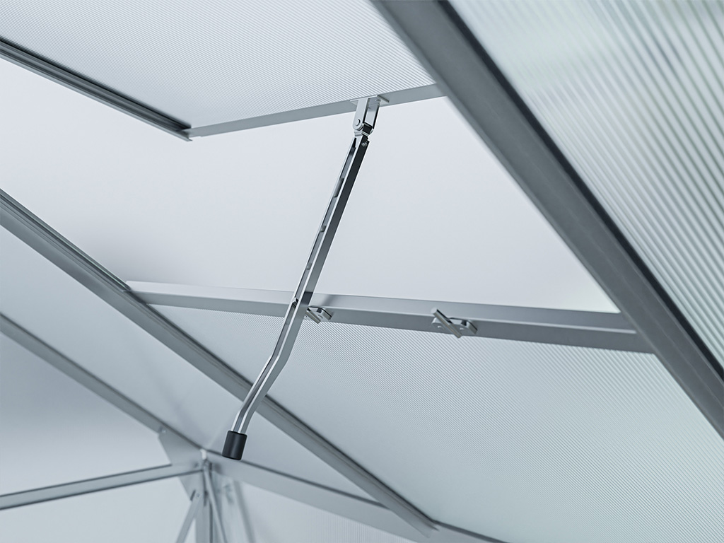 La fenêtre de toit incluse empêche la chaleur de s'accumuler dans la serre. - Fondation en acier en option (incluse uniquement dans la version « avec fondation » !)
