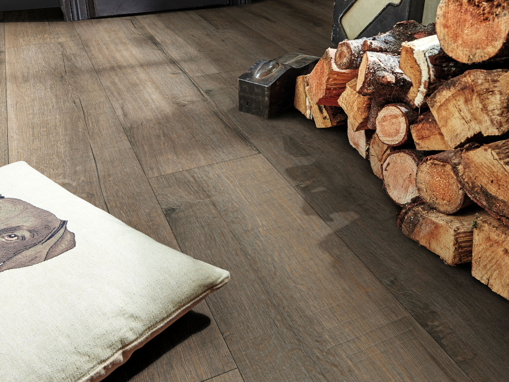 « Épaisseur 8 mm, système clic 5G Dry, sous-couche intégrée, adapté aux pièces humides, structure à pores, micro-chanfrein sur les 4 côtés