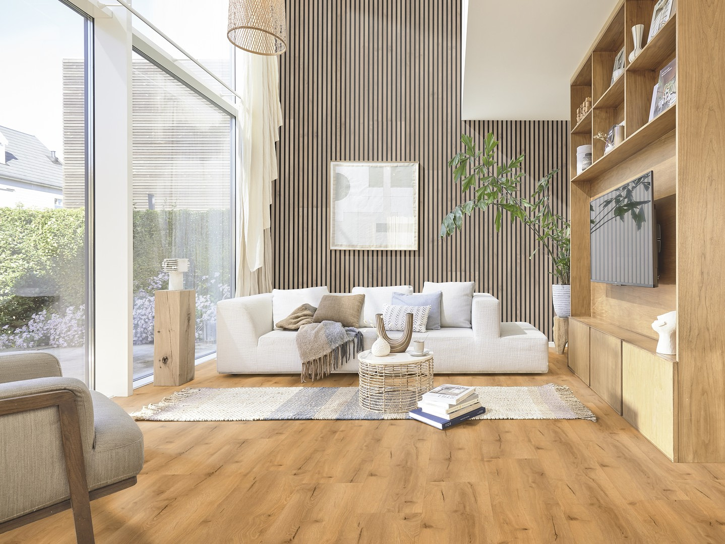 Épaisseur 5 mm, assemblage par clic, isolation intégrée, structuré, adapté aux pièces humides, chanfrein sur 4 côtés