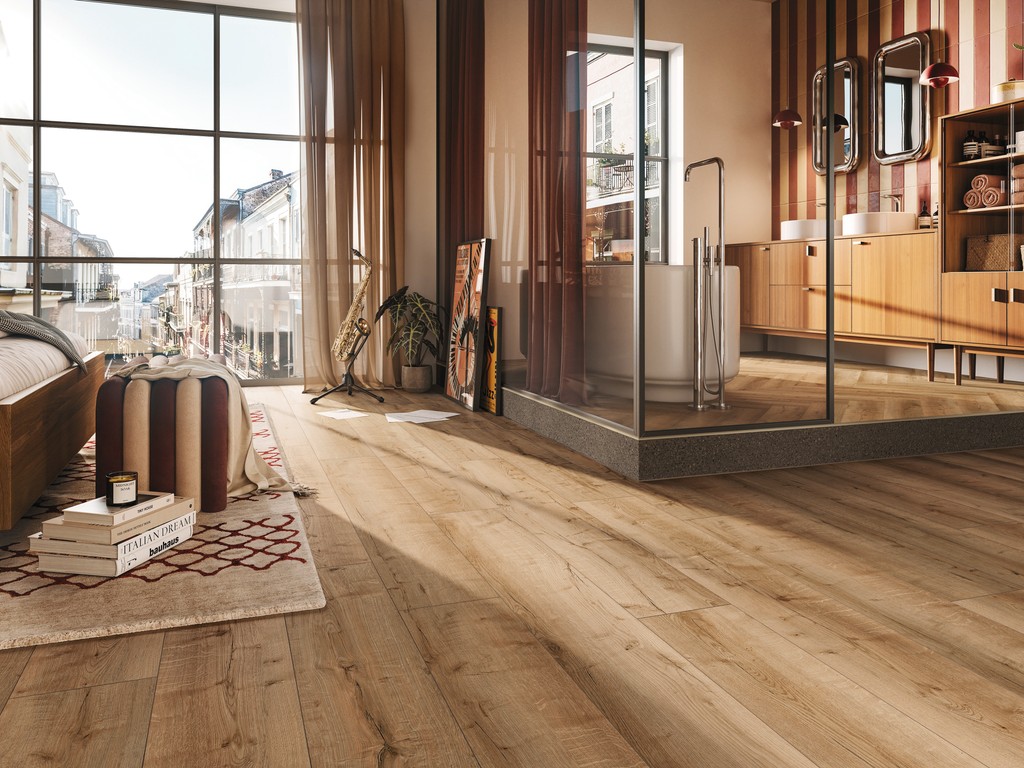 Épaisseur 6 mm, système d'assemblage par clic, isolation intégrée, surface structurée, adapté aux pièces humides, chanfrein sur les 4 côtés