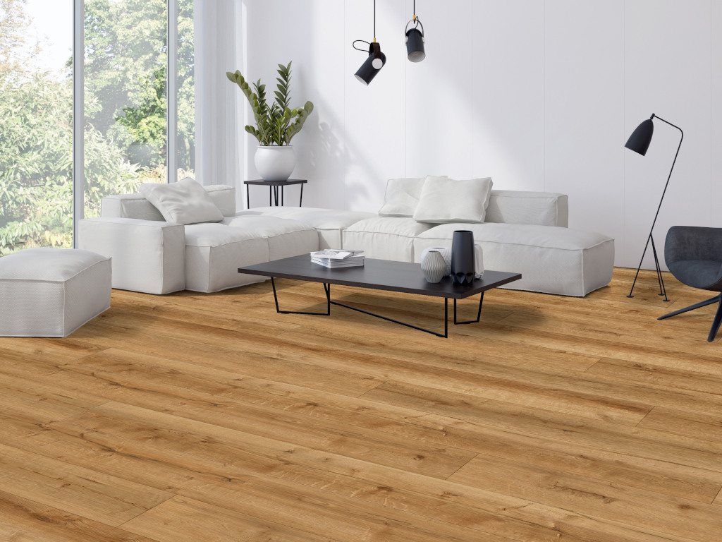 Le veinage typique du chêne de ce décor diffuse une élégance intemporelle et une chaleur accueillante. Les lames larges sont idéales pour celles et ceux qui souhaitent mettre en valeur le caractère authentique de leur sol — pour une ambiance rustique. Avec son veinage naturel, ce sol est le partenaire idéal de presque toutes les tendances d’intérieur. Les 4 chanfreins structurent le motif de pose et lui confèrent une trame régulière. La surface structurée suit le veinage et apporte à chaque lame une dimension tactile supplémentaire.