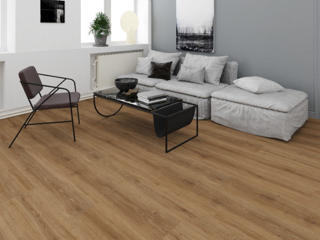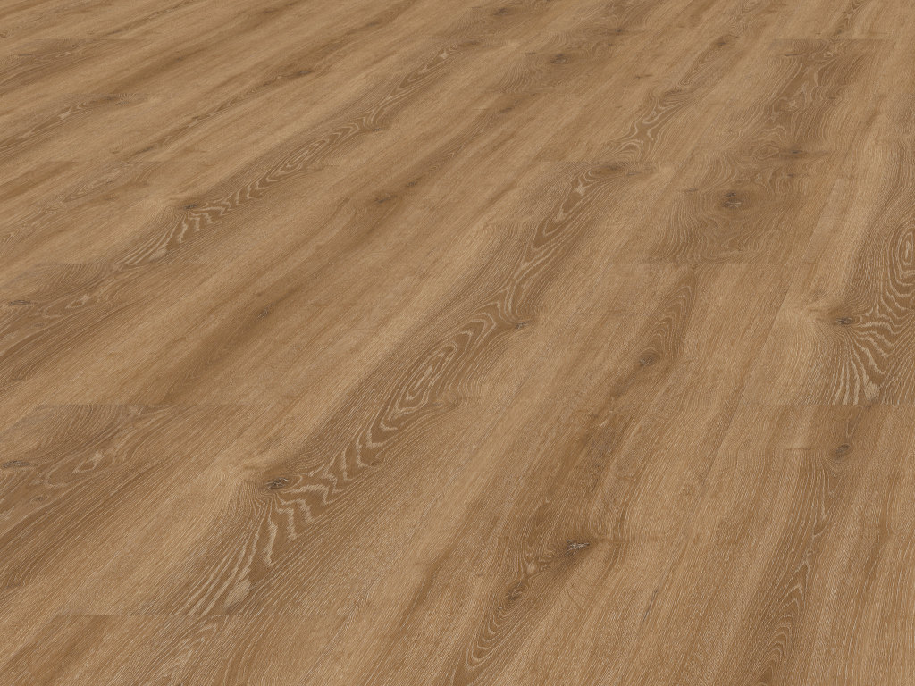 Les veines typiques du bois de chêne du décor dégagent une classe intemporelle et une chaleur confortable. Les planches larges à l'ancienne sont parfaites pour tous ceux qui souhaitent mettre en valeur le caractère authentique du bois de leur sol - pour une ambiance rustique. Avec ses veines naturelles, ce sol est le partenaire idéal pour presque toutes les tendances en matière d'habitat. Le chanfrein périphérique sur les quatre côtés structure l'image de pose et lui confère un motif régulier. La surface structurée s'oriente sur le veinage et confère en outre à la planche une composante haptique.