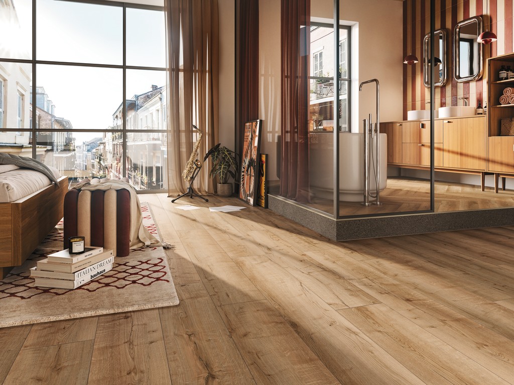 730 x 146 x 5 mm, assemblage par clic, isolation intégrée, structuré, adapté aux pièces humides, micro-chanfrein sur les 4 côtés