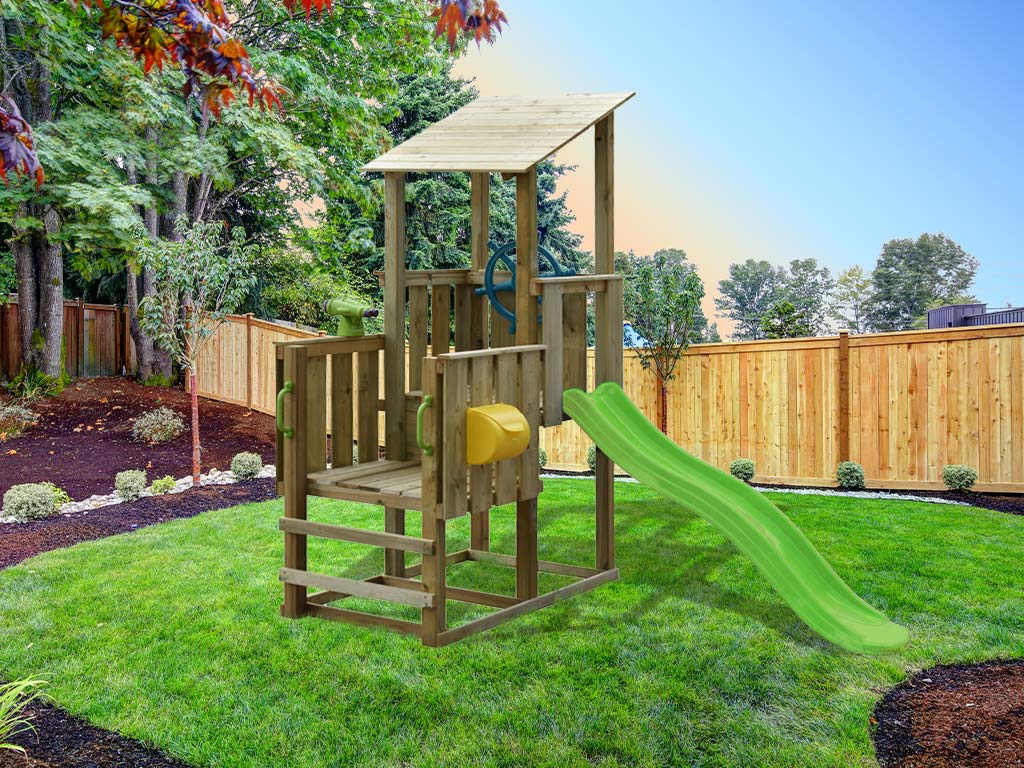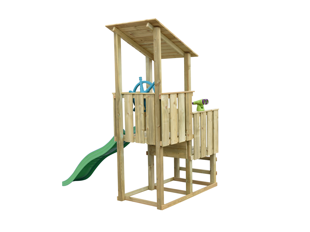 Aire de jeux Pirate en bois autoclave avec 1 toboggan vert + accessoires