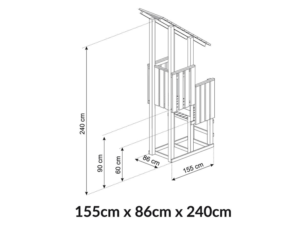 Dimensions (L x P x H) : 261 x 155 x 240 cm, avec volant de pirate, boîte aux lettres, longue-vue, poignées et toboggan vert