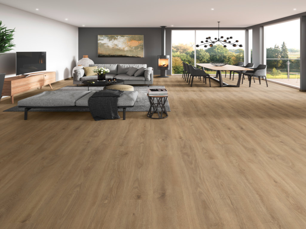 1288 × 195 × 8 mm, système clic, convient aux pièces humides, aspect bois sur toute la surface
