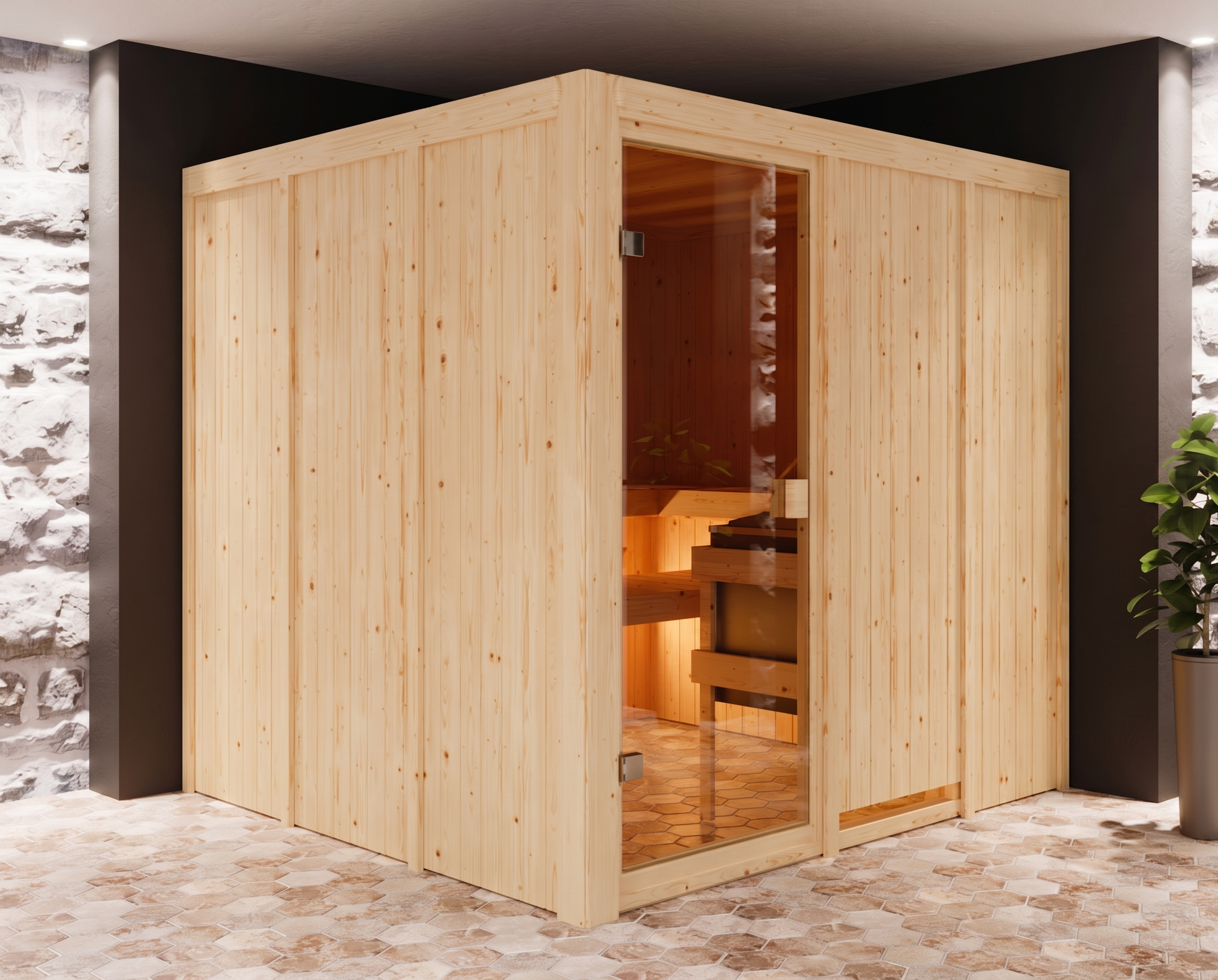 L x P x H : 196 x 196 x 198 cm, 3 bancs, poêle de sauna de 9 kW avec commande intégrée incluse.