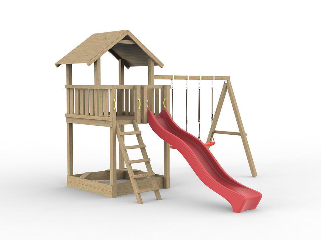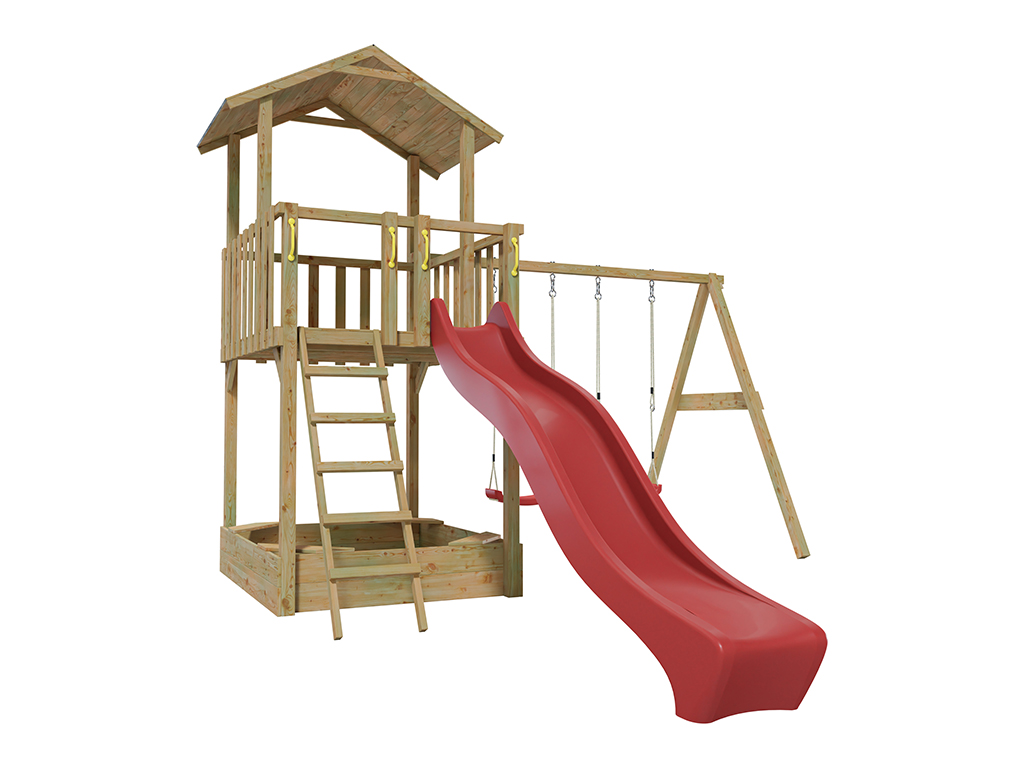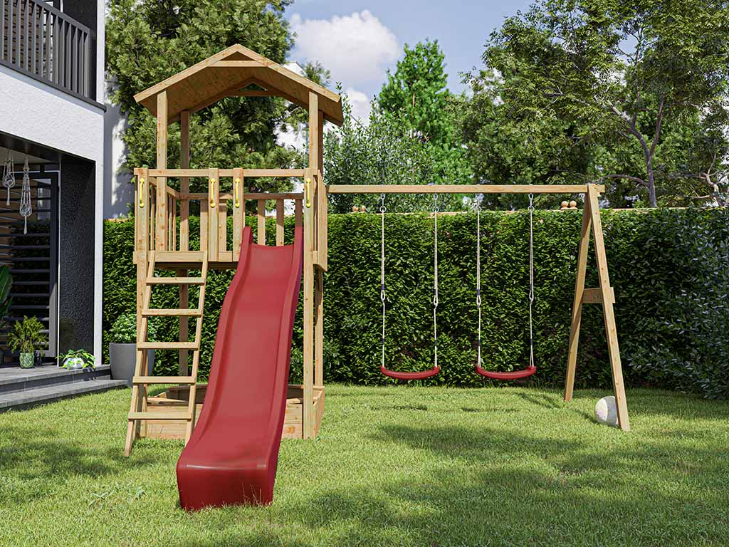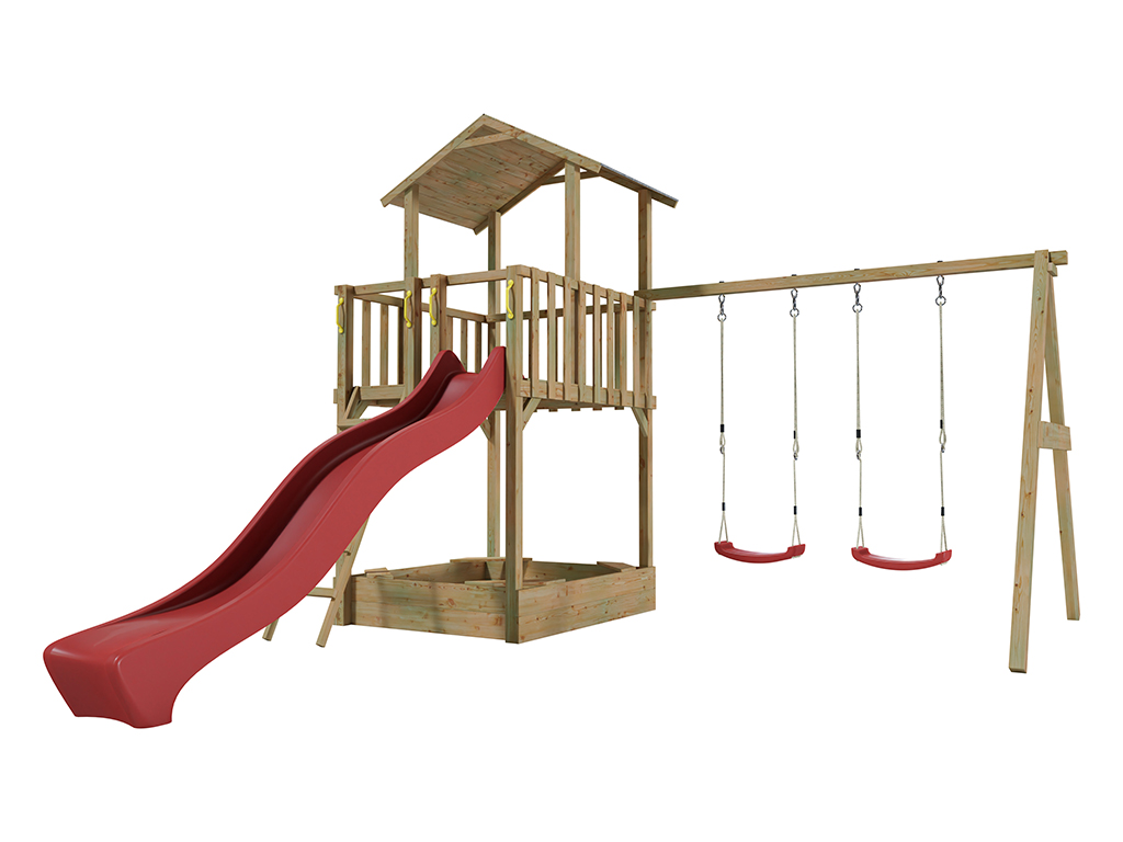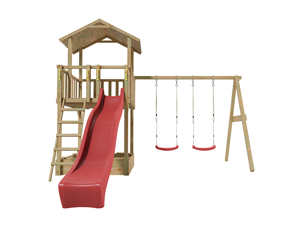 Aire de jeux Tilly Classic en bois autoclave avec portique double, toboggan rouge et sièges rouges