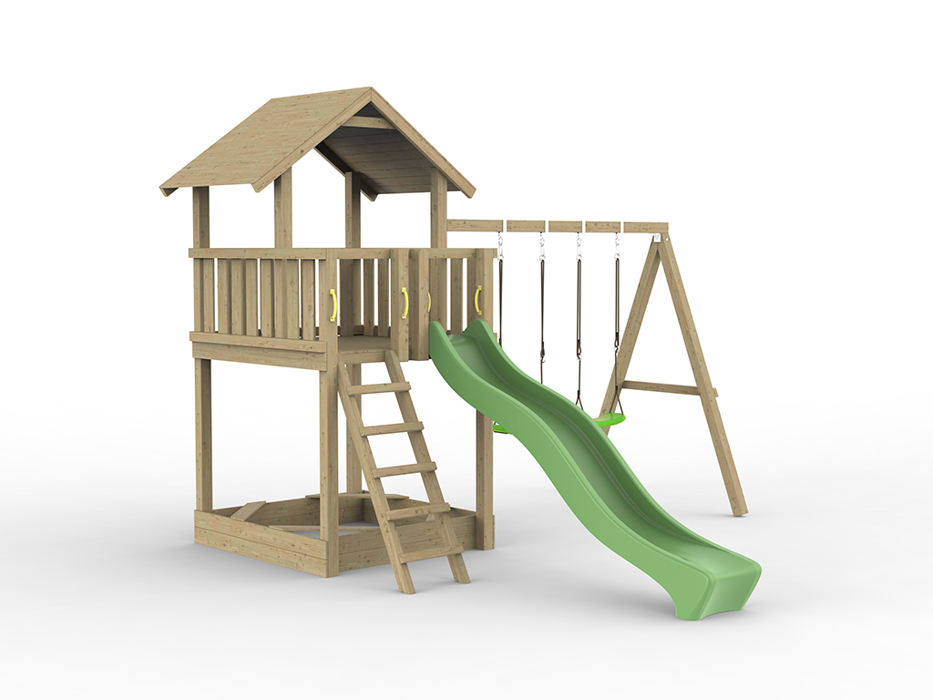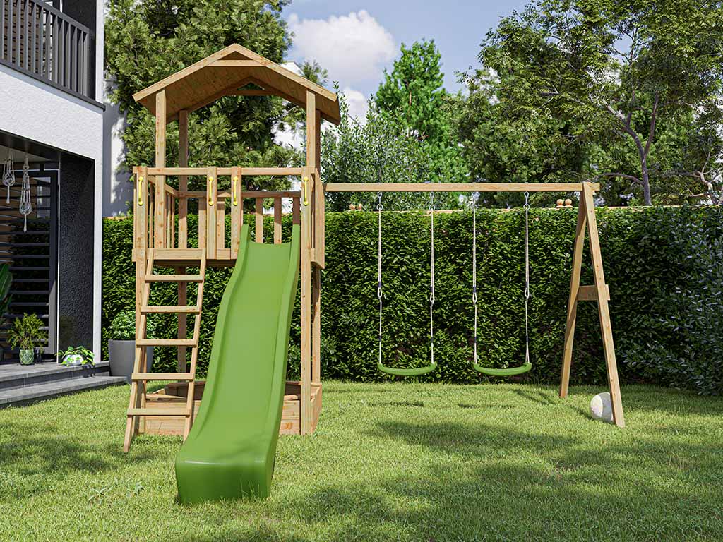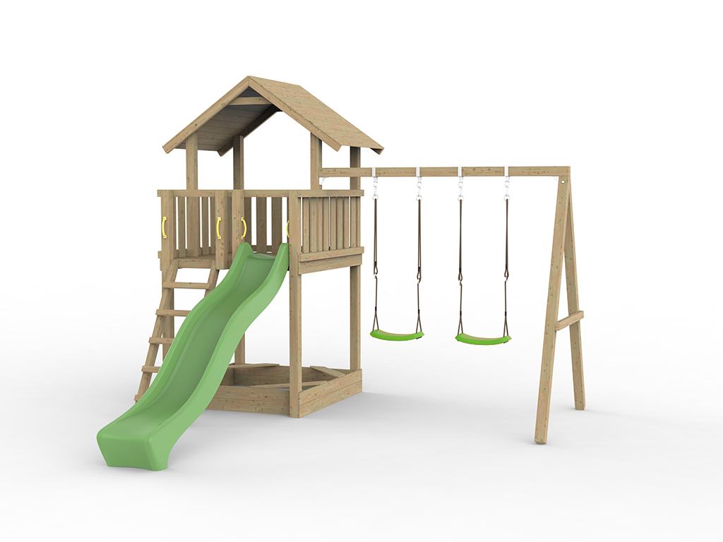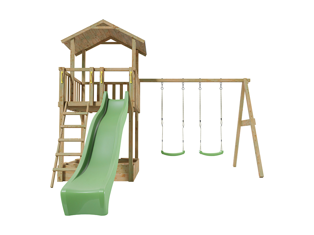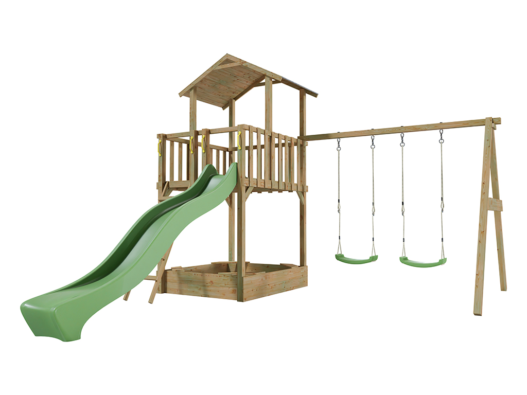 Aire de jeux Tilly Classic en bois autoclaveavec portique double, toboggan vert et sièges verts