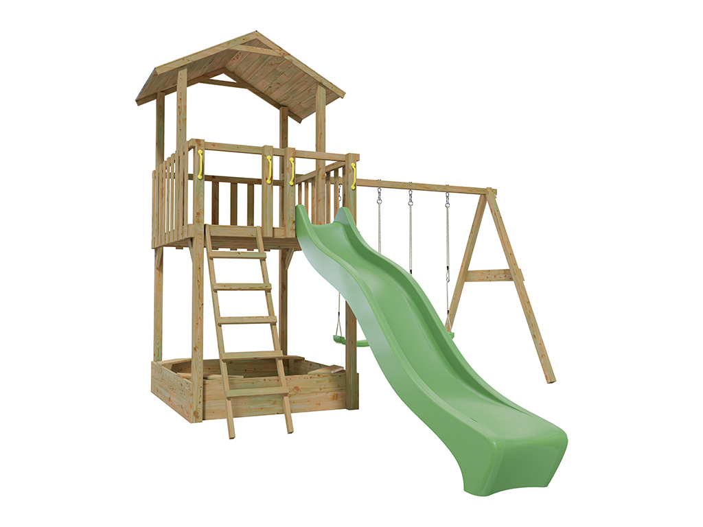 Un toboggan à vague vert de 2,9 mètres, conçu pour être fixé à la plateforme, est inclus dans ce pack économique. Avec quelques ajustements simples, le toboggan peut se transformer en toboggan aquatique : un raccord pour tuyau d’arrosage est prévu sous le toboggan, qu’il suffit de percer à l’aide d’un trou. - Avec bac à sable