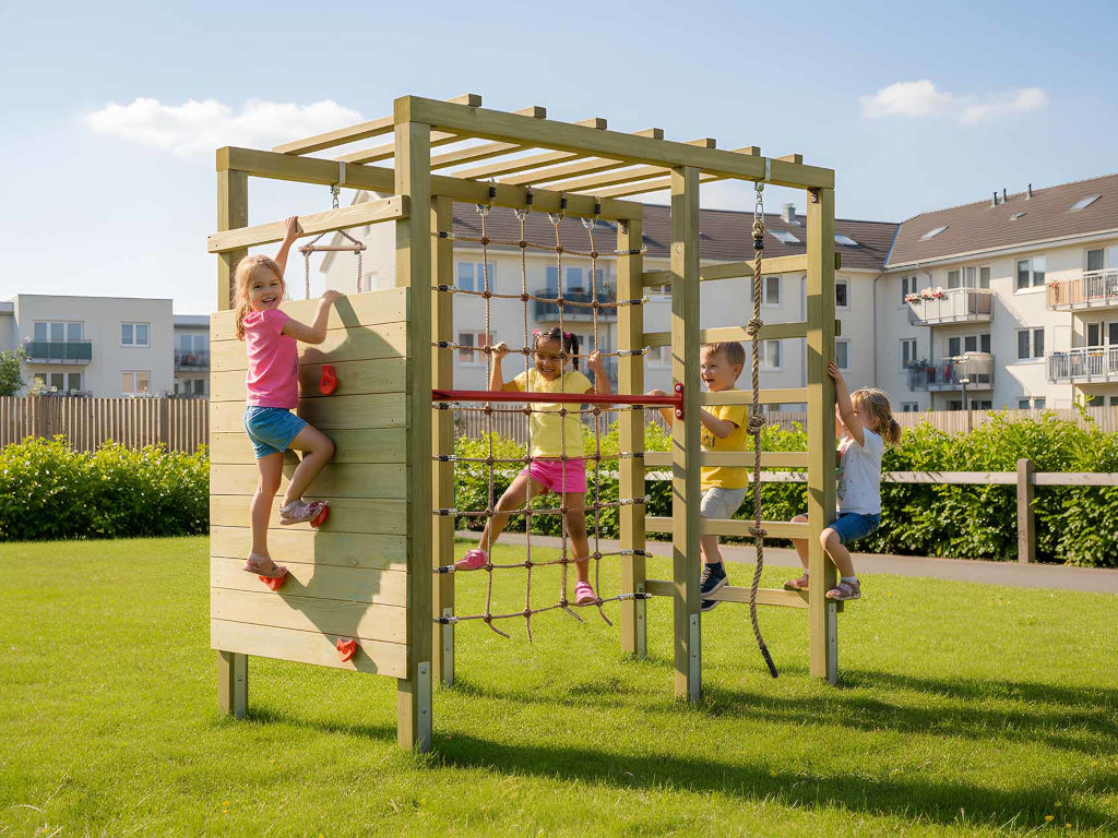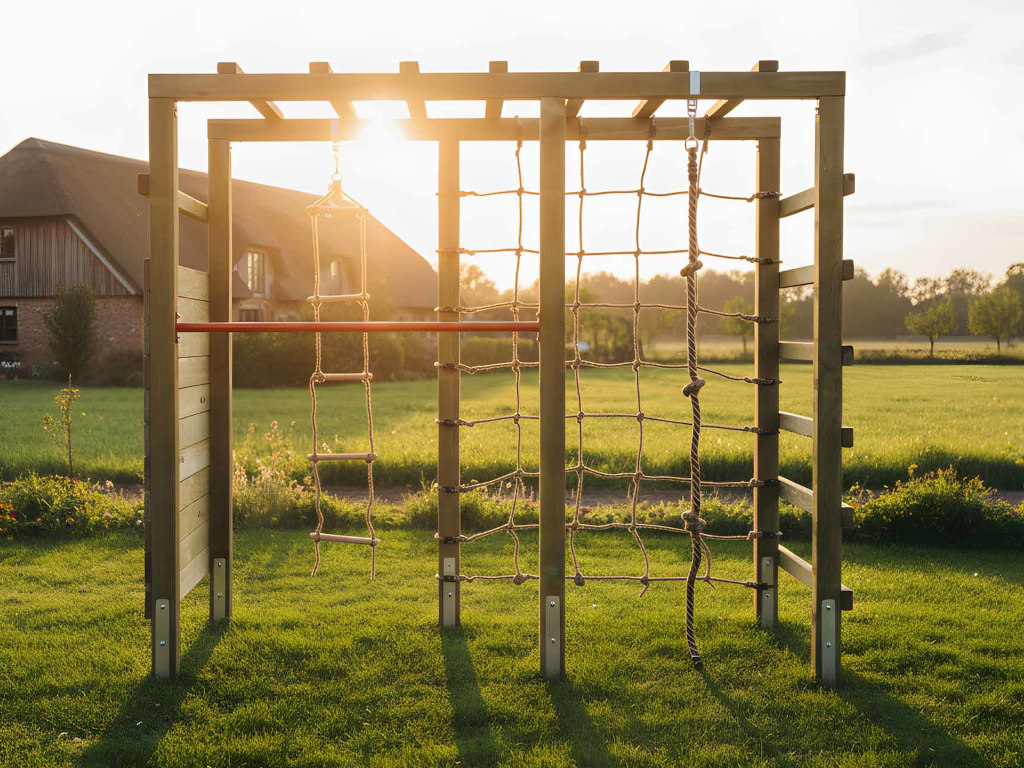L x P x H : 240 x 120 x 219 cm, avec mur d'escalade + filet d'escalade, avec corde + échelle de corde + barre fixe