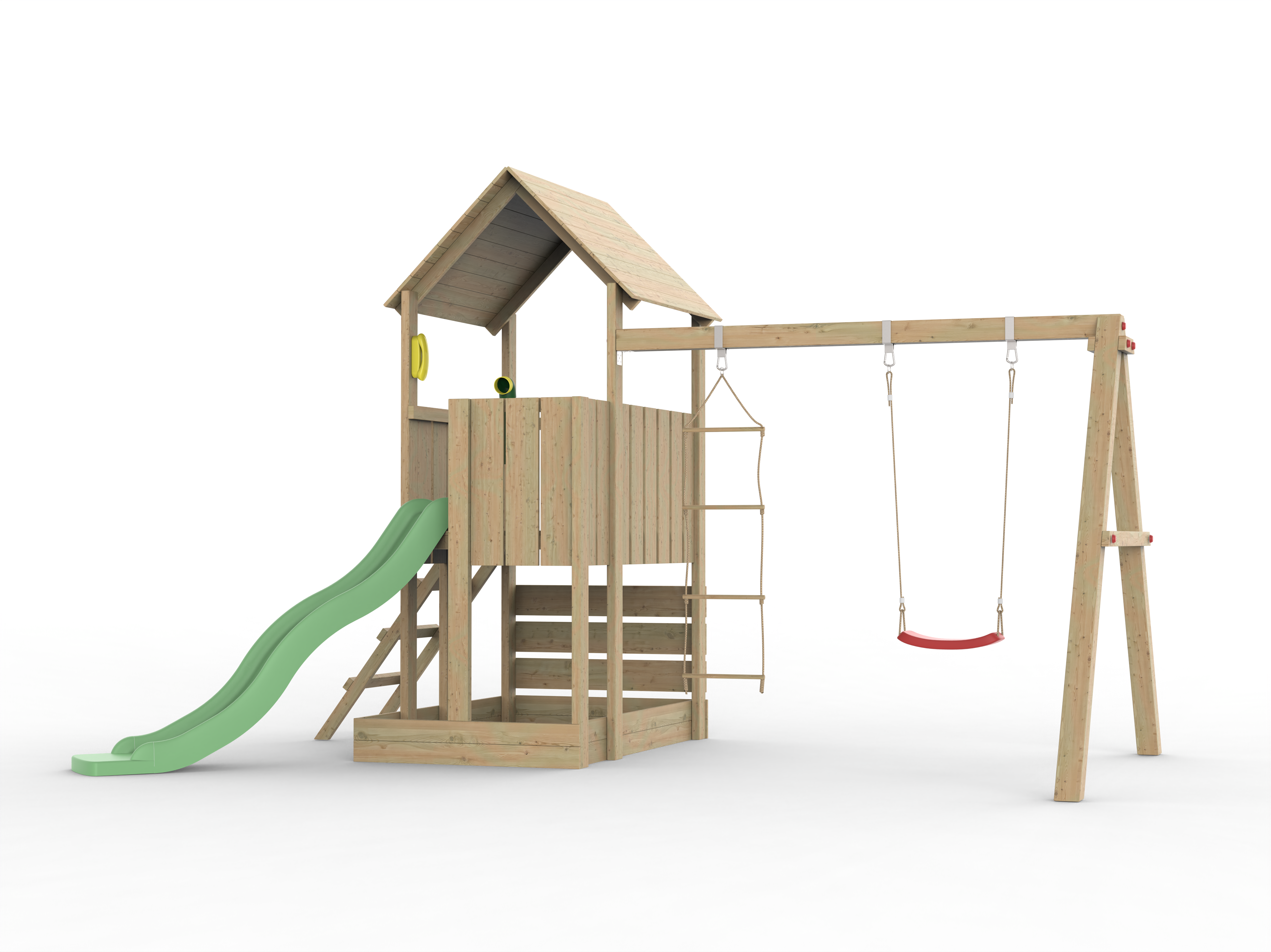 La tour de jeux est fabriquée en bois de pin profilé imprégné en autoclave, ce qui la rend particulièrement résistante aux intempéries. Les poteaux de 4 x 9 cm et de 3 x 9 cm d'épaisseur confèrent à la tour de jeux une stabilité maximale.