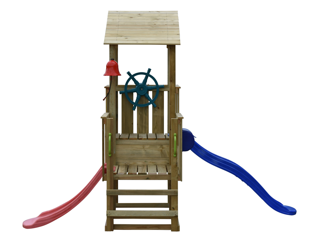L’aire de jeux peut être complétée, au choix, par une ou deux glissières de toboggan. Pour cela, il suffit de retirer les garde-corps aux emplacements prévus. Avec des accessoires supplémentaires tels qu’un volant de pirate ou une longue-vue, vous pouvez enrichir encore davantage les possibilités de jeu. Consultez notre large sélection d’accessoires. - Montage simple et rapide